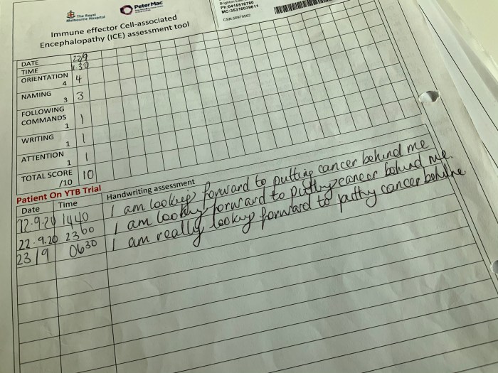 But back to the brain stuff – now as part of my program of routine observations I’m doing an ICE assessment (that stands for Immune effector Cell-associated Encephalopahy). Here’s the sheet for that – one of the first signs is deteriorating handwriting.